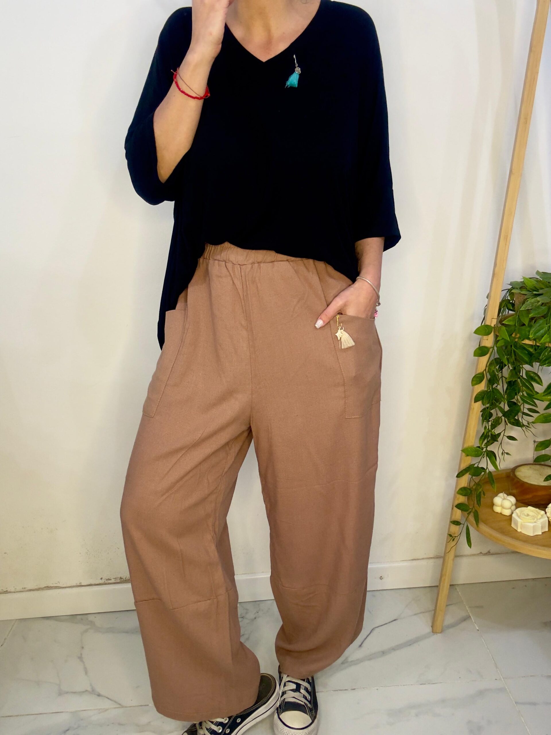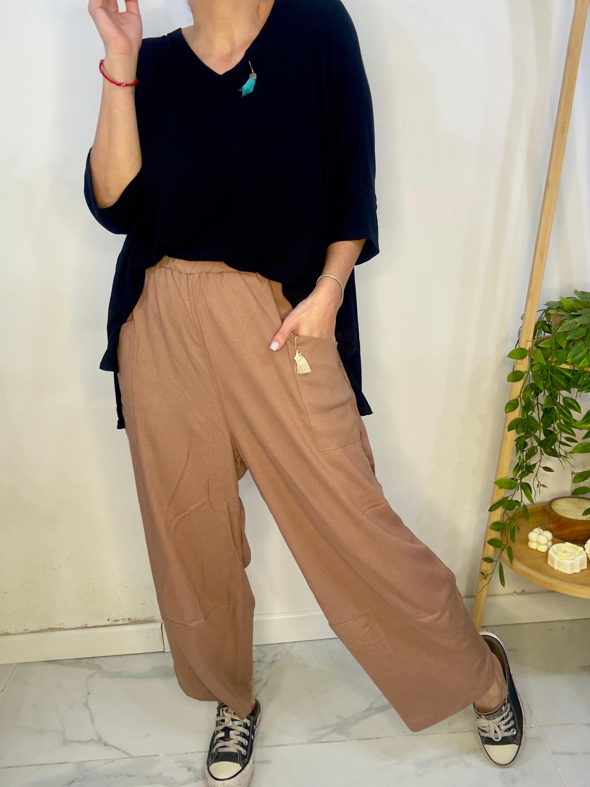 Pantalón babucha de tela tipo lino sastrero tiene una calidad tremenda 😍⚠️ 🥰súper  amplio   con una caida que la rompe  🤍es tipo capri lo cual 🙏🏼no tenes q preocuparte si te queda más corto o largo 🤍el color es un tema Aparte porque están hermosos 🤍Son sueltos por ende  los talles no son tan Exactos♥️♥️ la idea es estar cómodas y estos son perfectos 🤙🏻para eso 💪🏻lo podes hacer monocromo o mandarle algún color que corte en liso 🤍 tene en cuenta el Bello detalle de su tela  que es lo más 🔥sirve para darle loockete de día y de noche 🙏🏼♥️ Es un pantalón con caída tremenda no duro por ende esta tremendo no es ancho de pierna más bien rectito .
