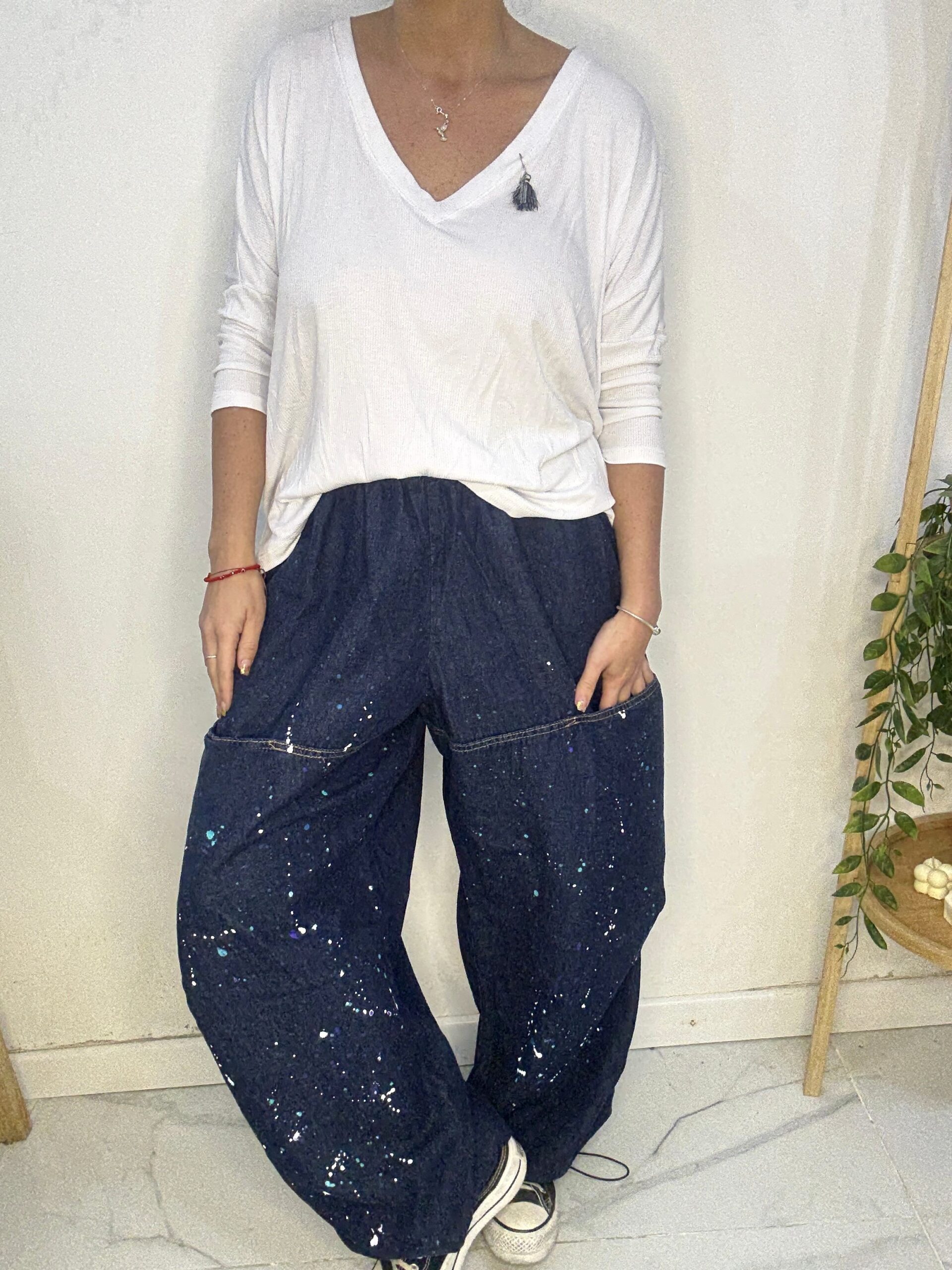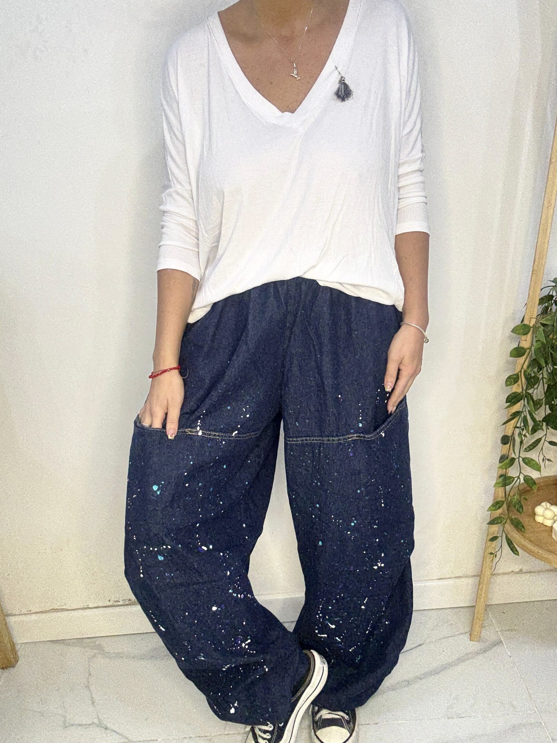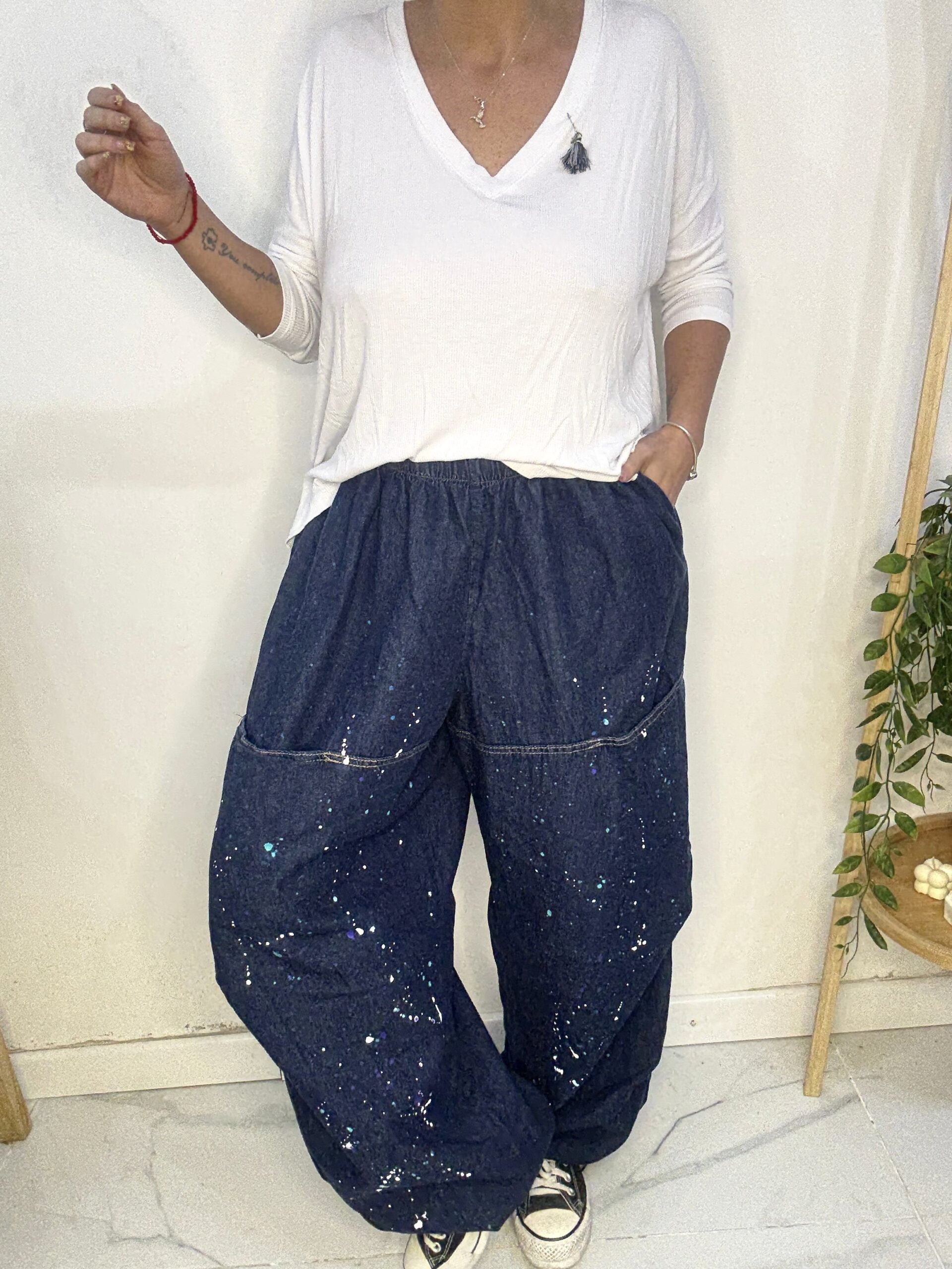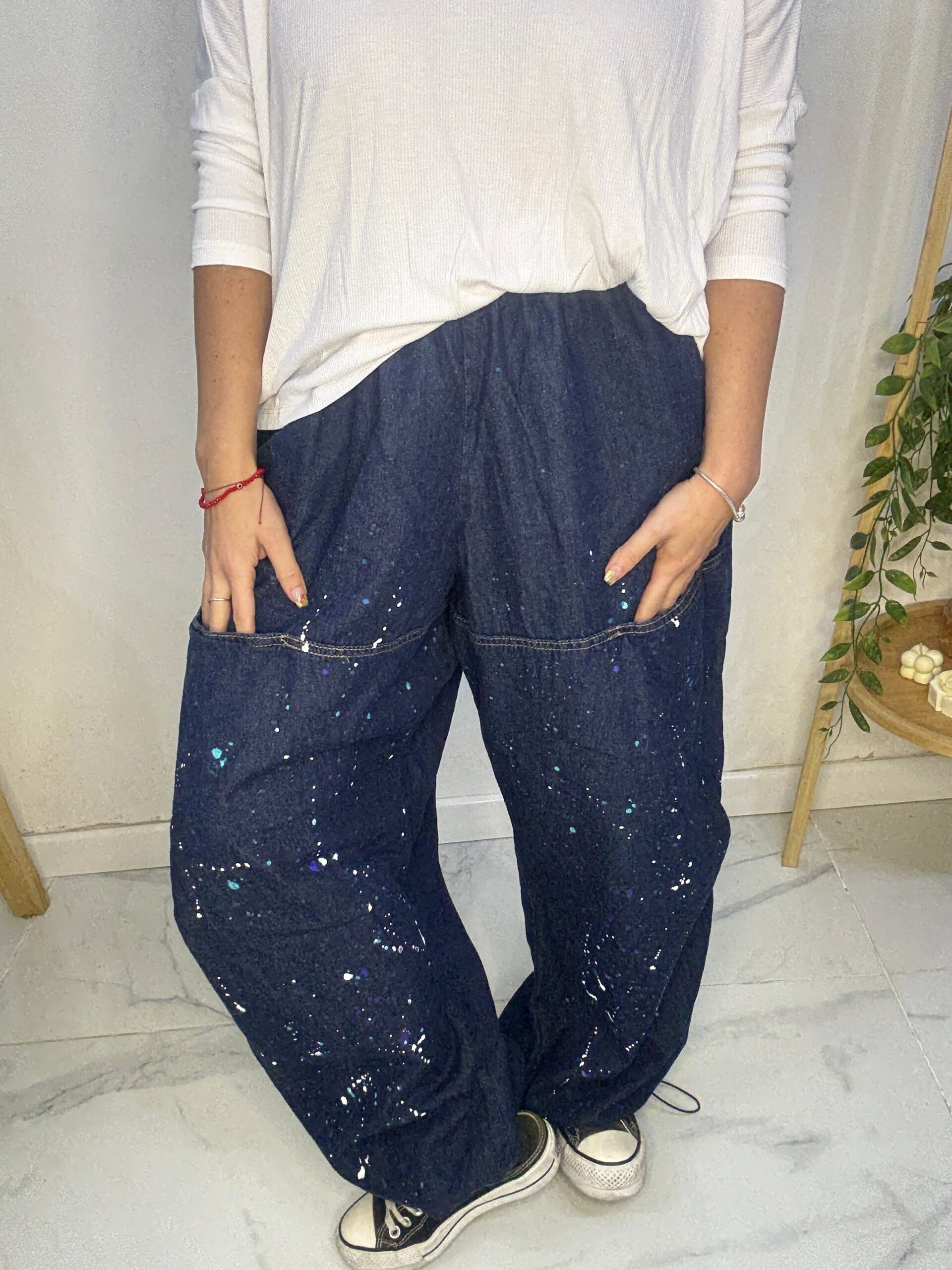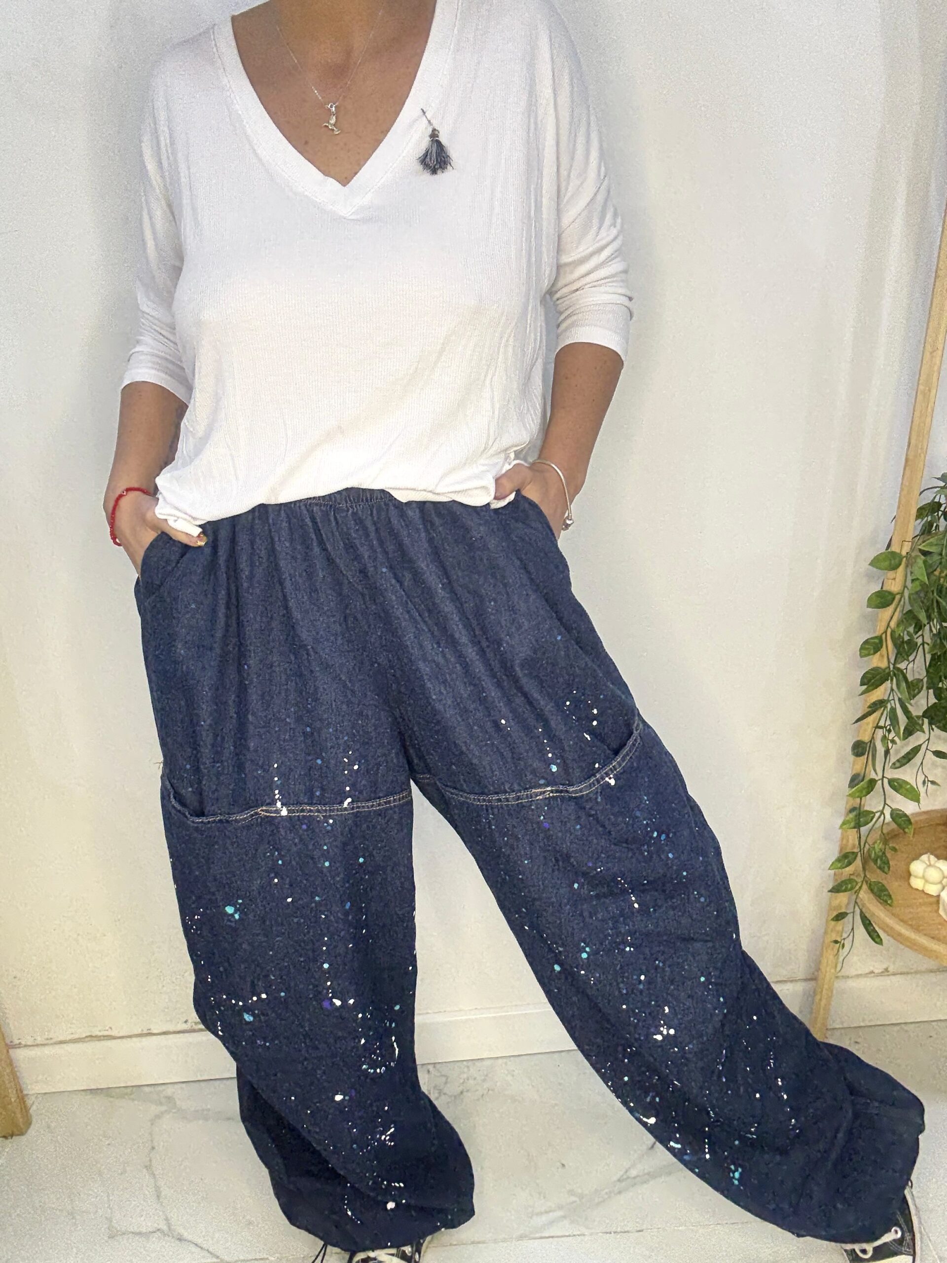 babucha de JEAN 😍 súper amplia con una caida que la rompe, son pintadas a mano, lo cual le da una exclusividad y un toque único a la prenda son artesanales y súper diferentes♥️