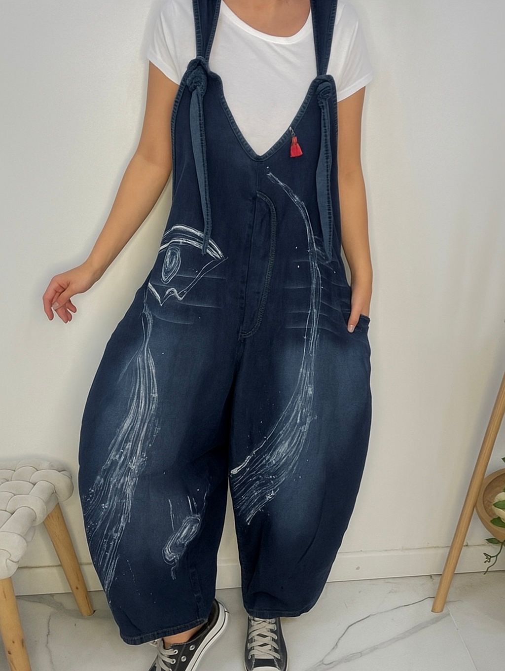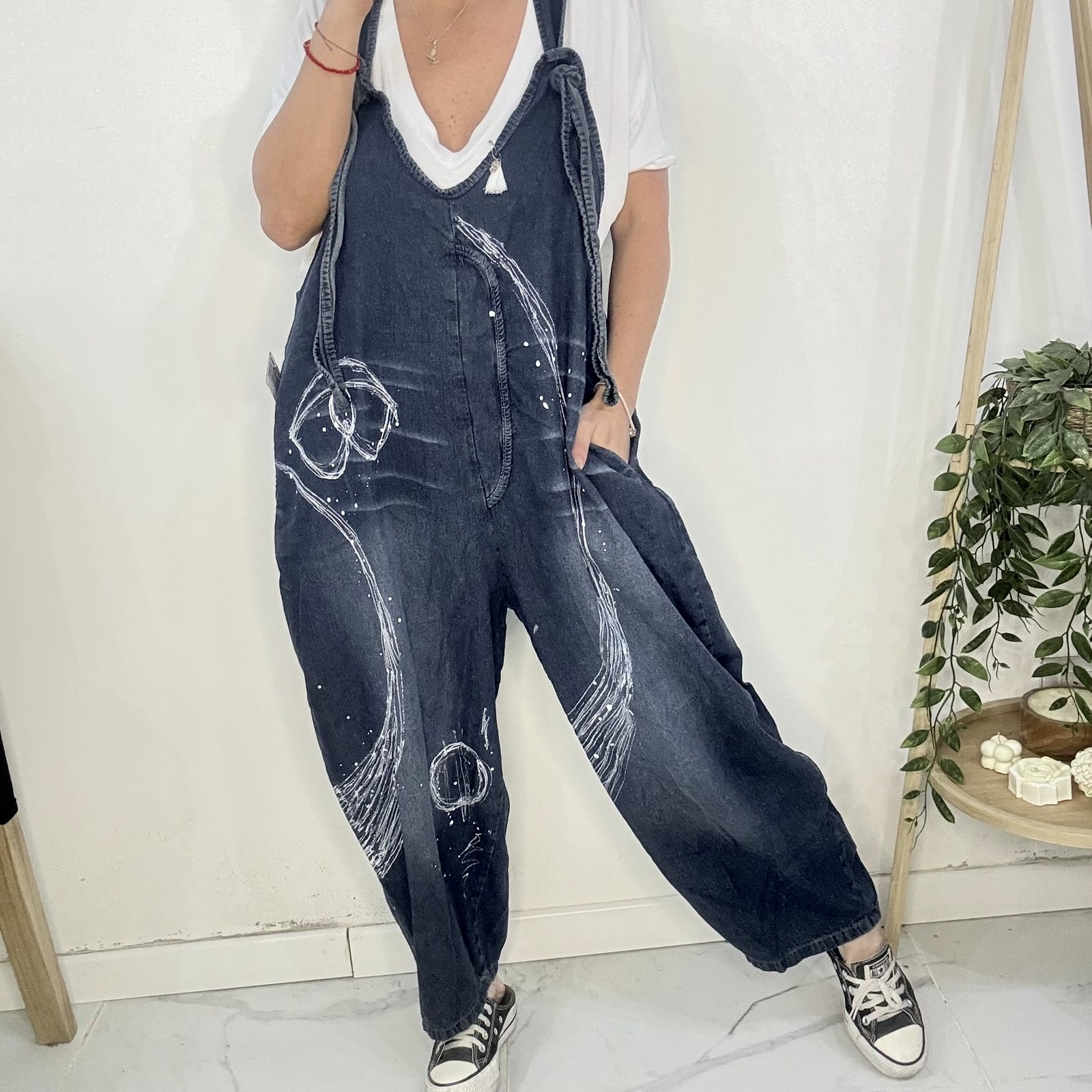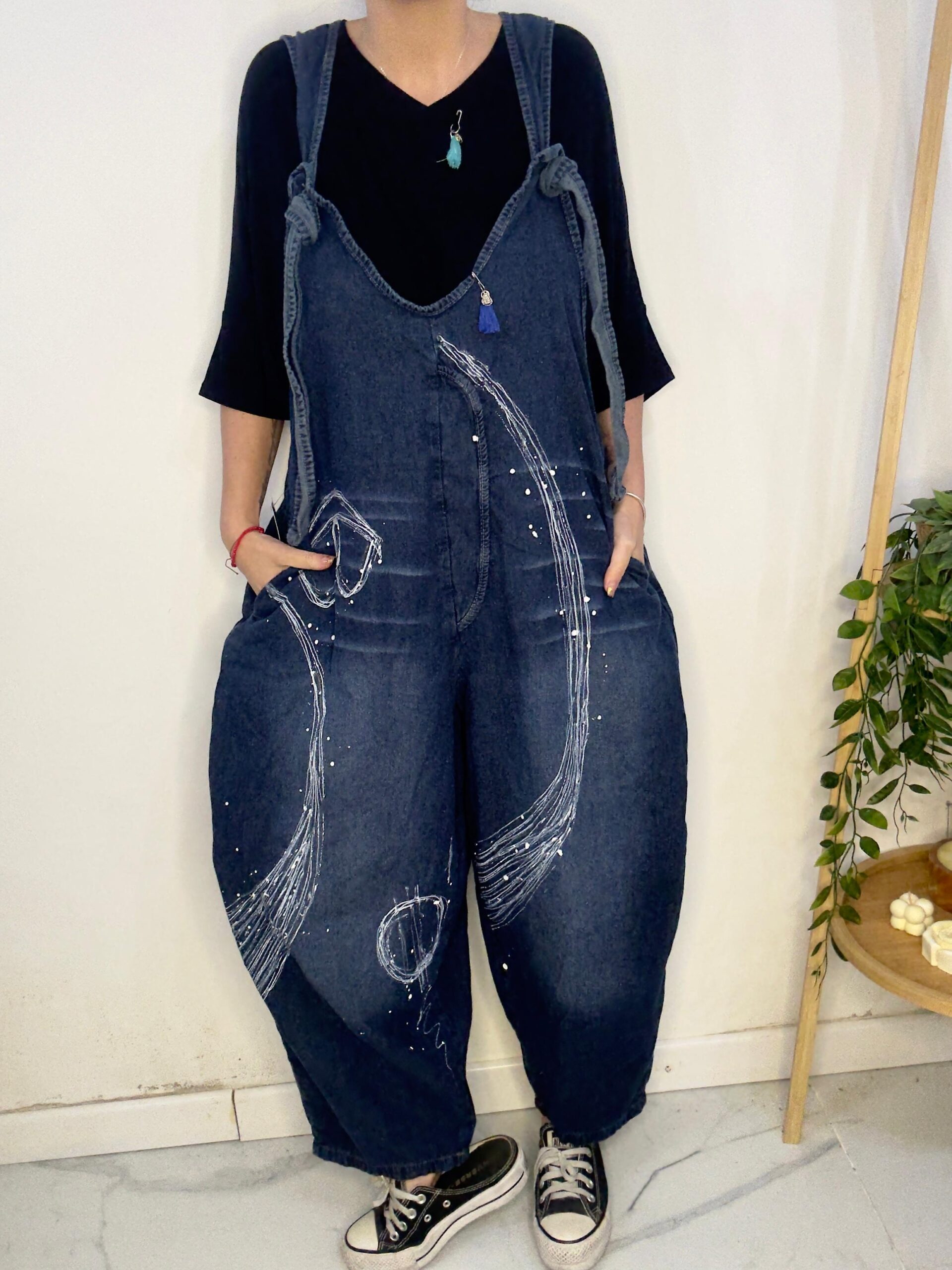 Mono PINTADO A MANO 🤍 diseño artesanal hecho uno por uno ☝🏼 🎨 es de Jean súper cómodo y canchero es un mono amplio y súper suelto 🐵tiene tiras regulables lo q permite regular el largo ♥️
