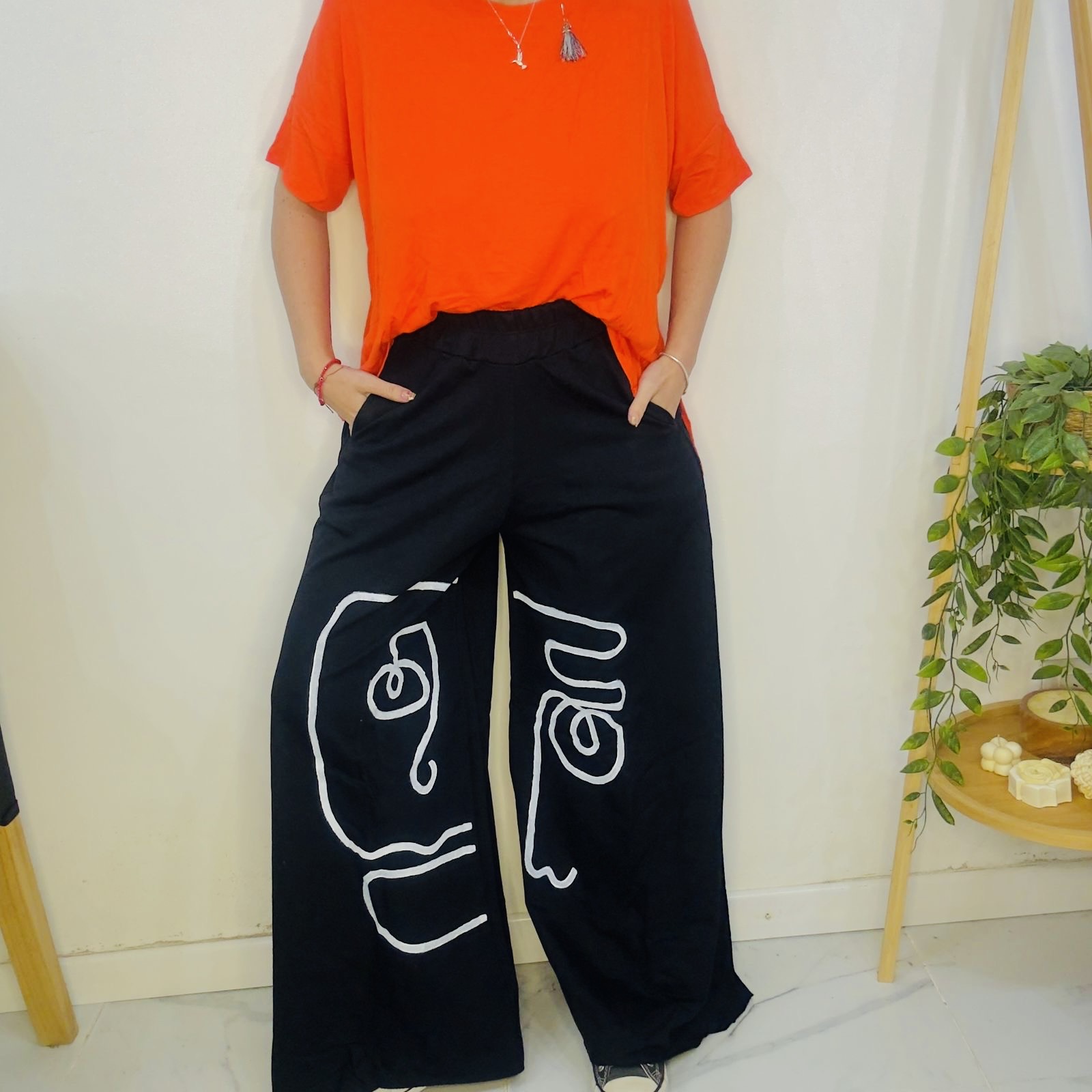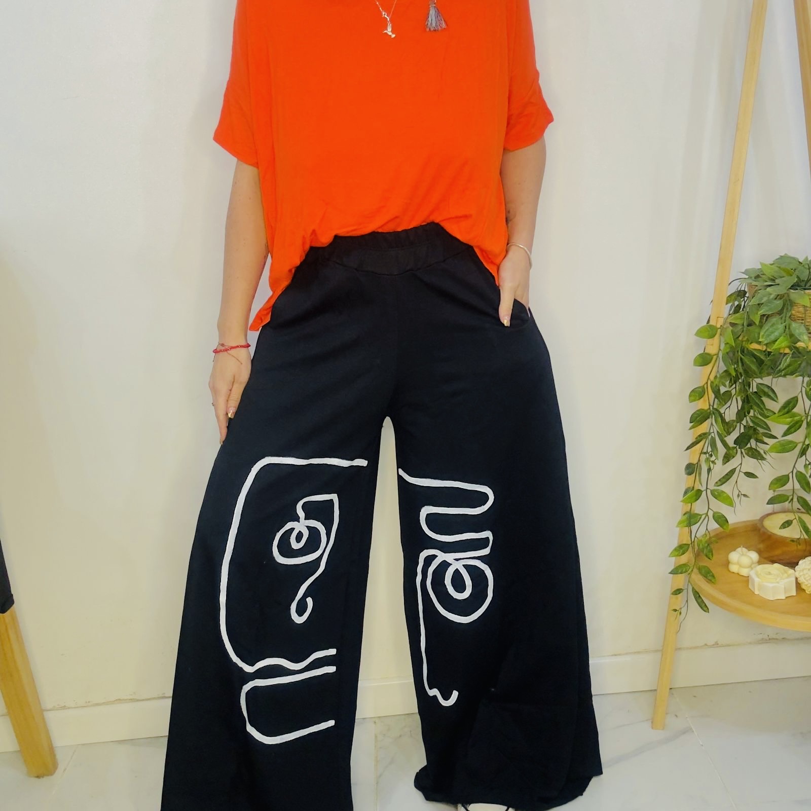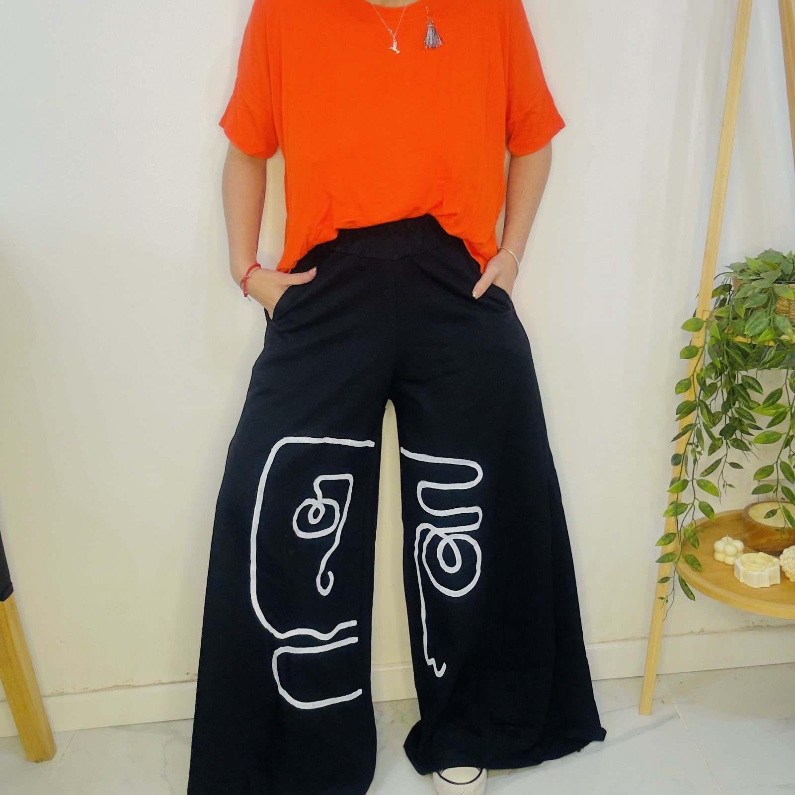 Su corte es divino parece una pollera pantalón su elástico, posibilidad amolar a diferentes cuerpos✨ y al ser tan ancho el detalle pintado le da una continuidad a la prenda uniéndose en el centro el diseño y generando una estética visual, súper atractiva y diferente♥️🎨