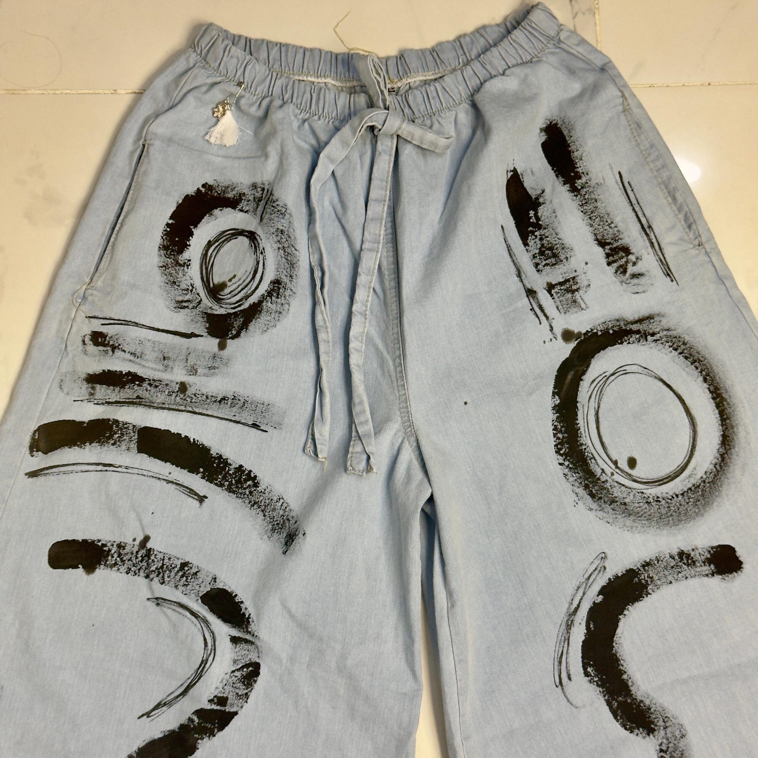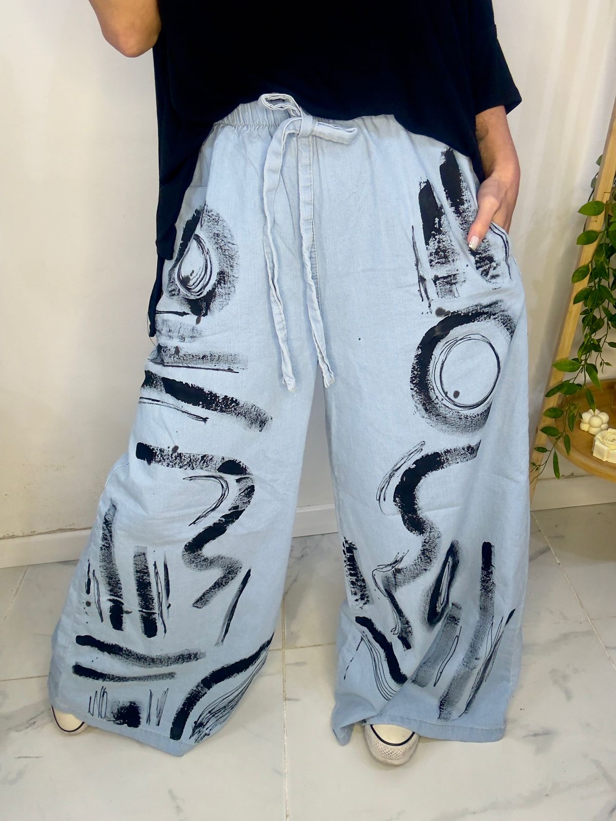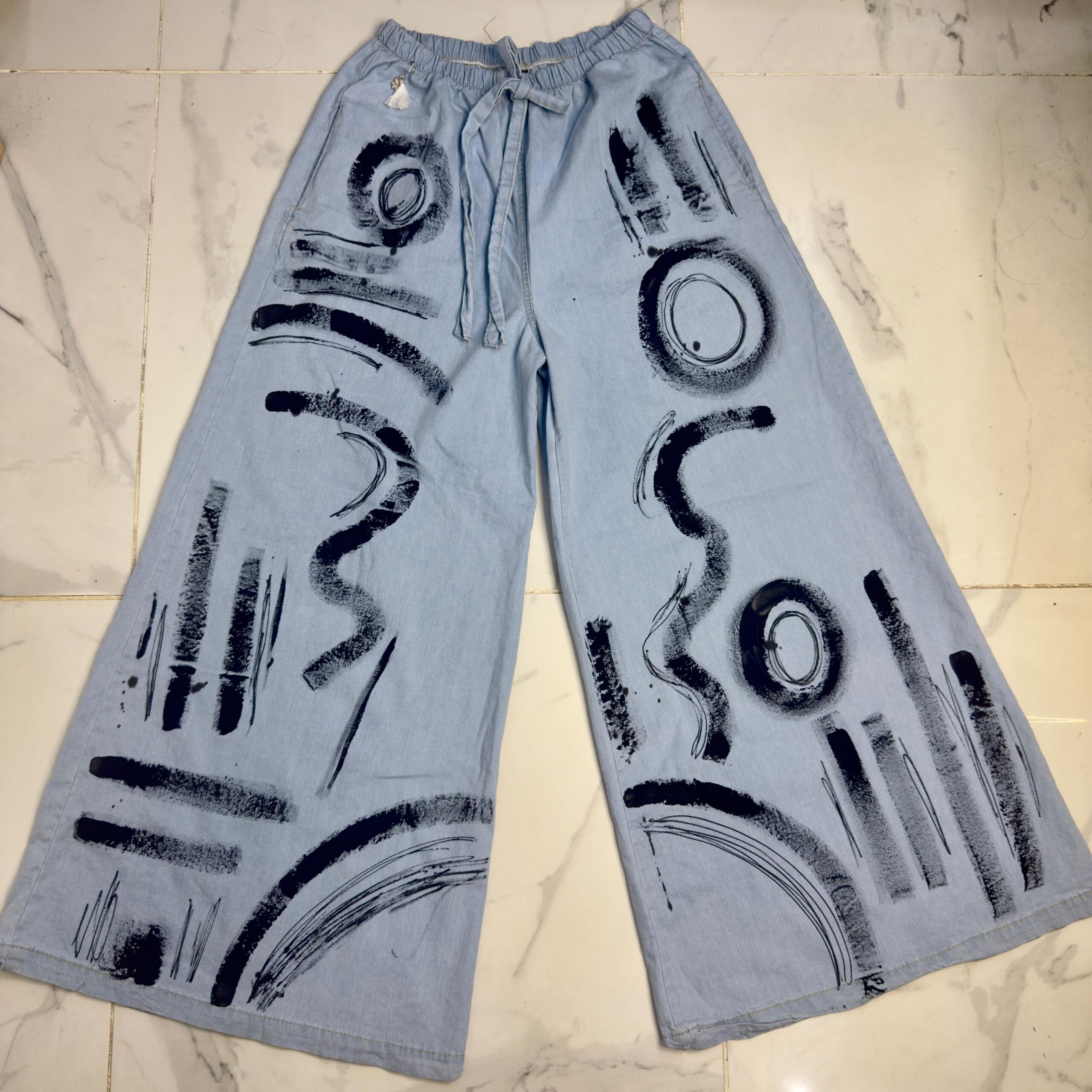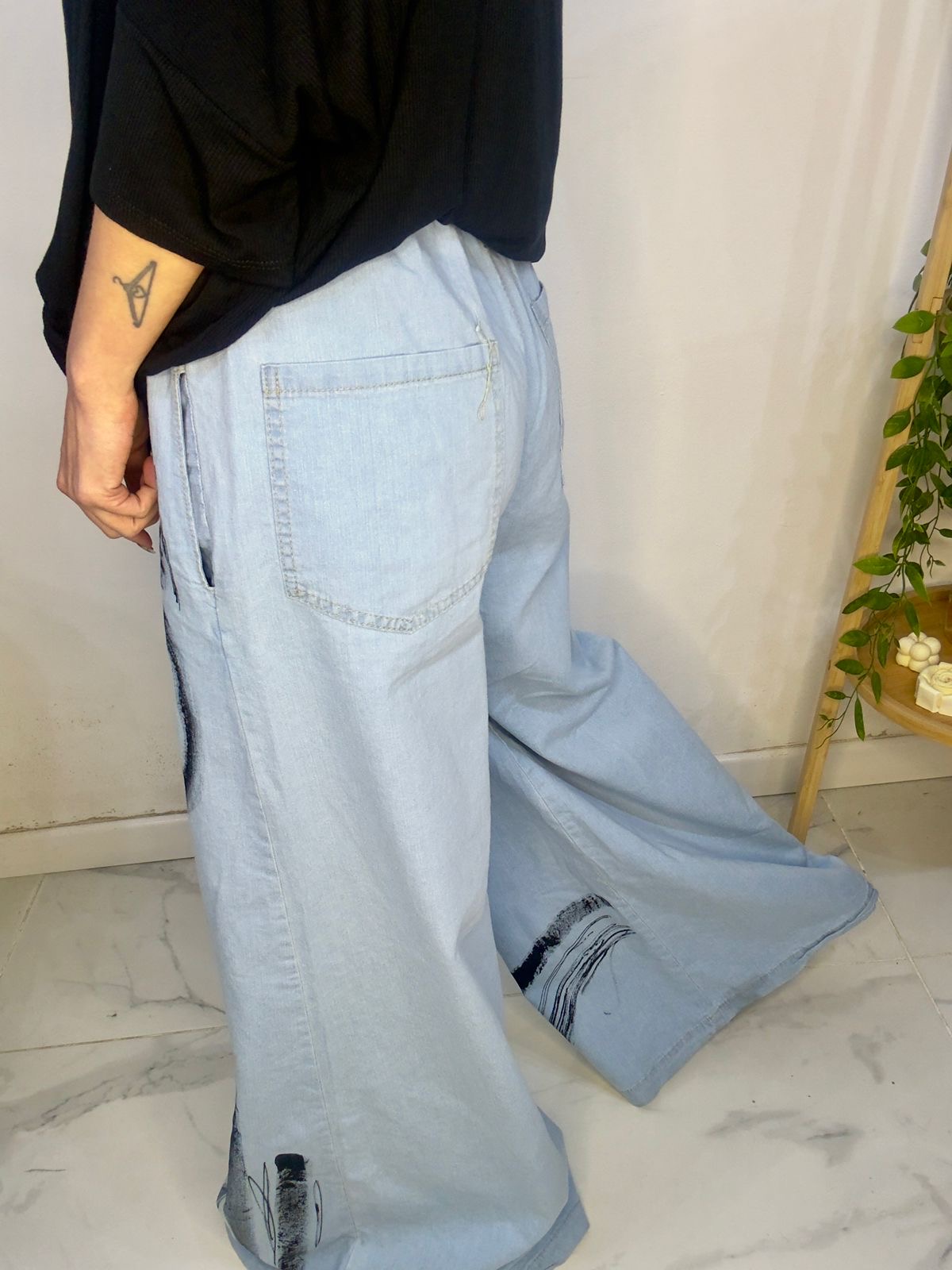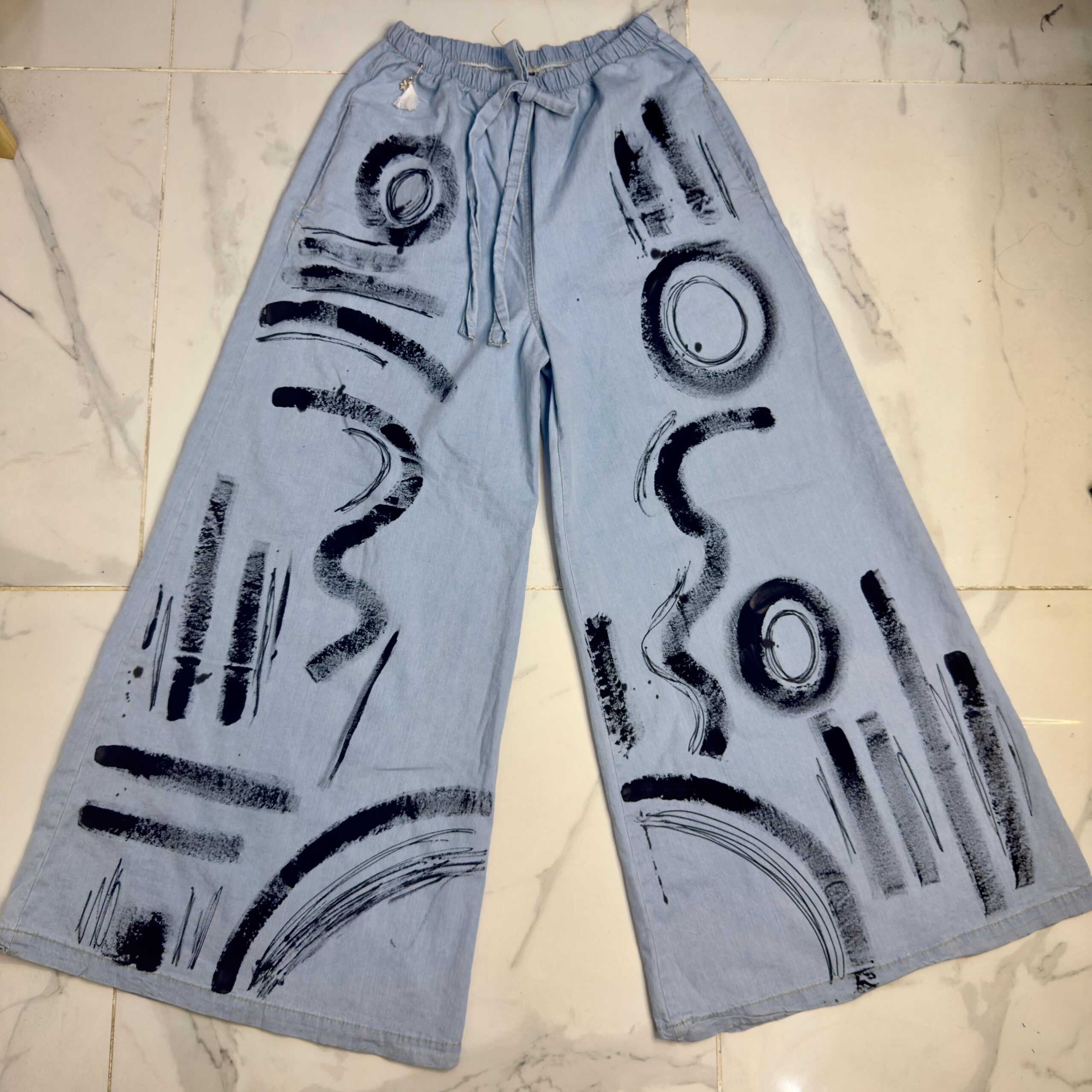 Pantalón de JEAN pintado a mano 🎨 😍súper amplio con una caida que la rompe 🤍 tipo pantalón pollera 🤍su cintura es elástica !!!