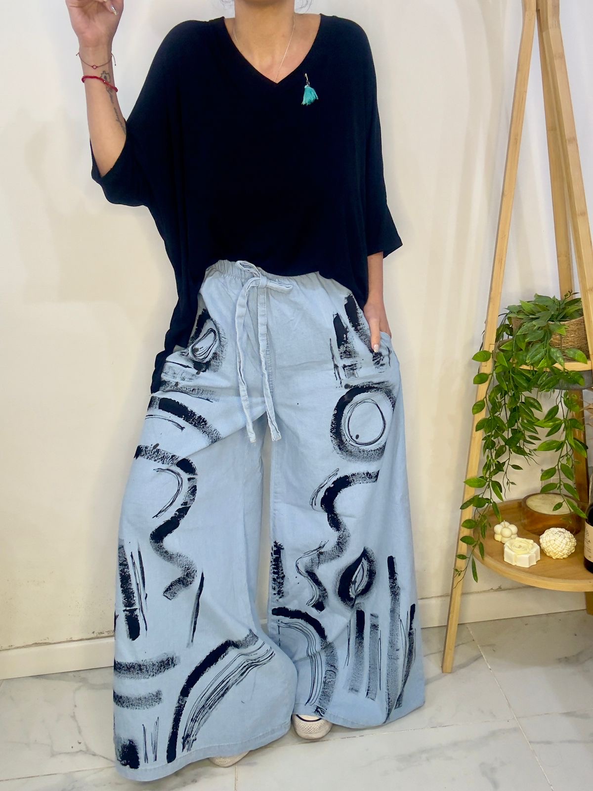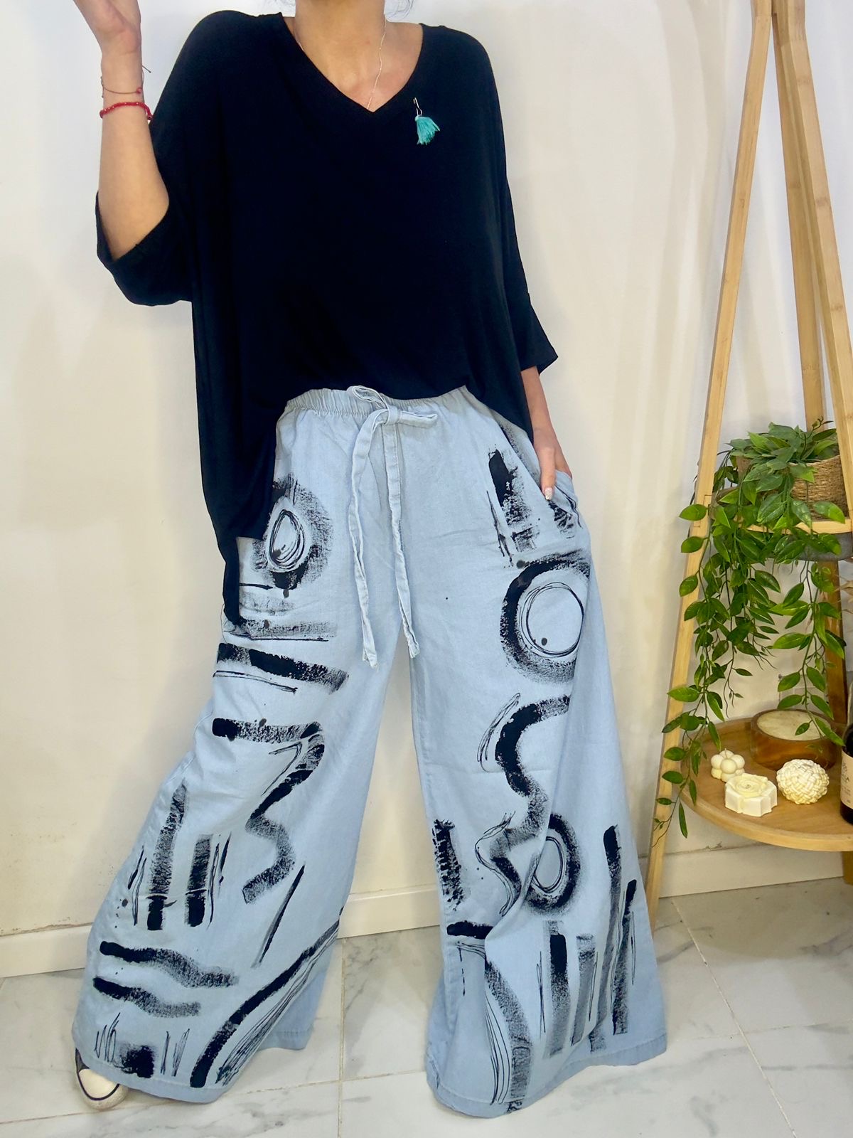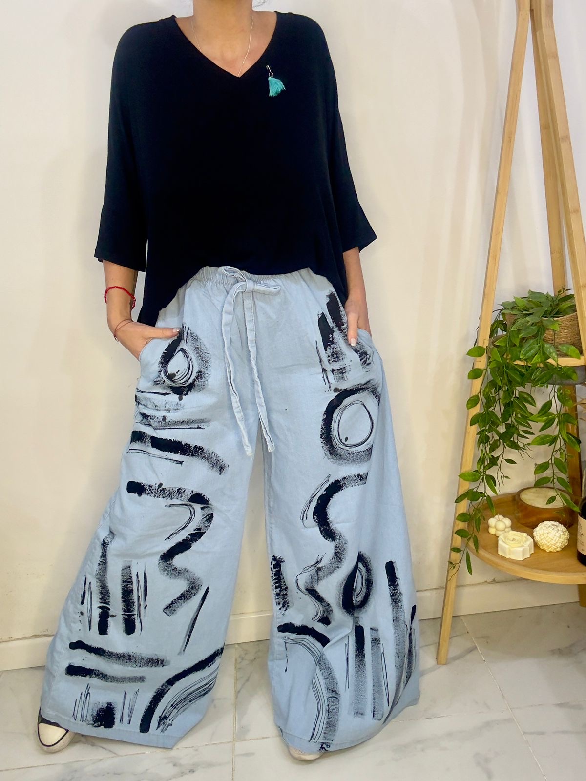 su pintura lo hace un pantalón único y diferente generando una personalidad en la prenda que te hará brillar donde vayas 🥰✨