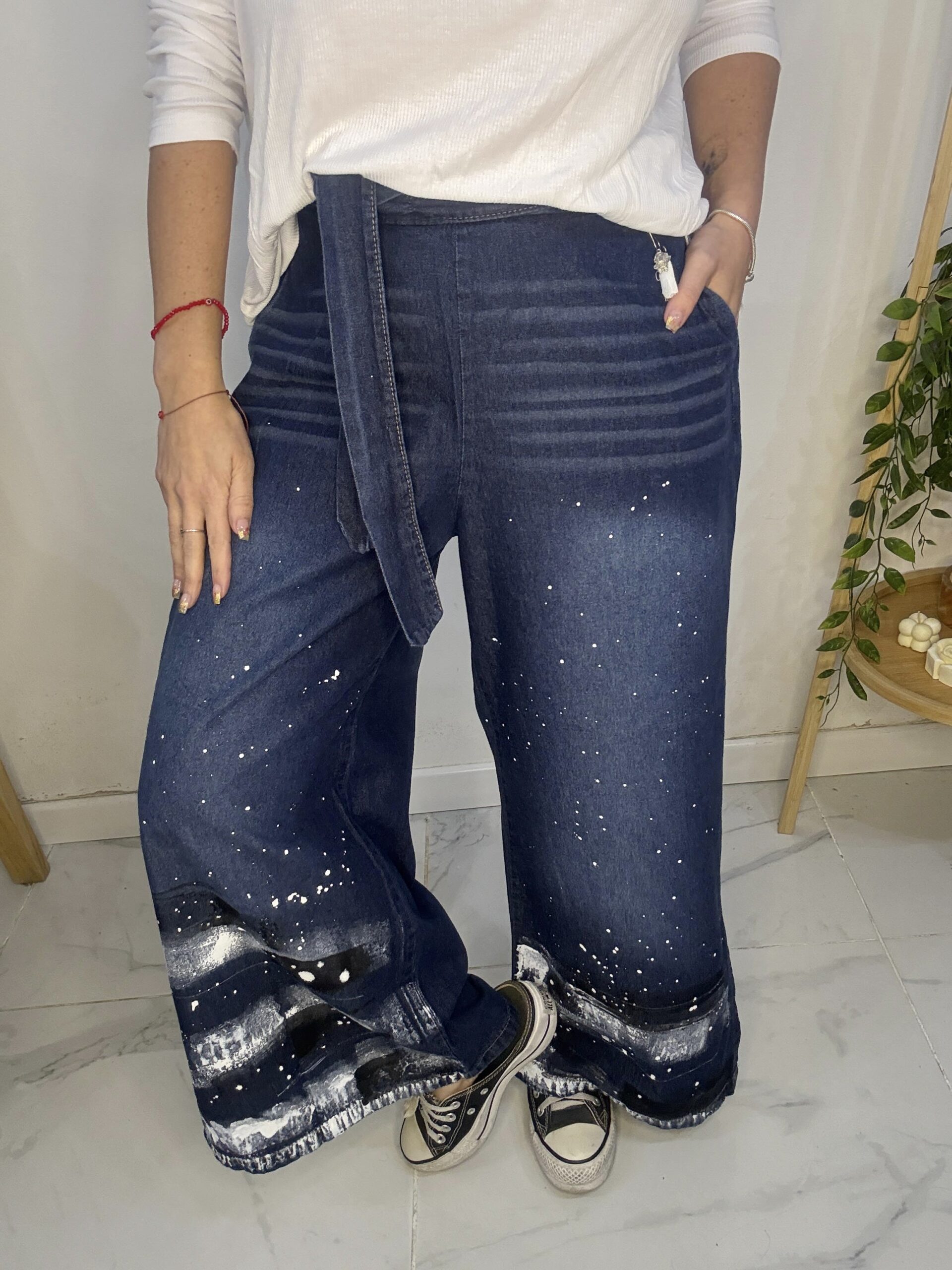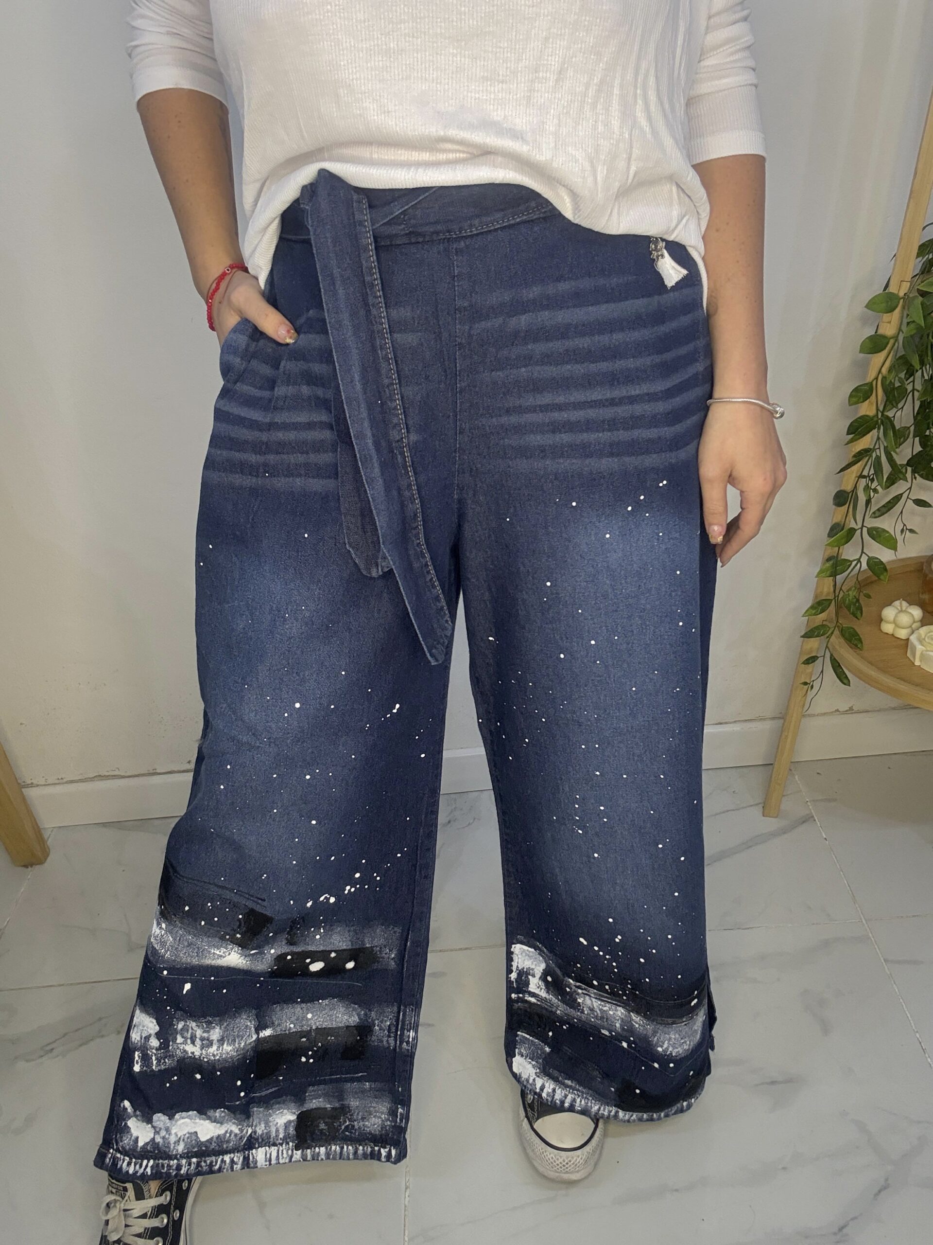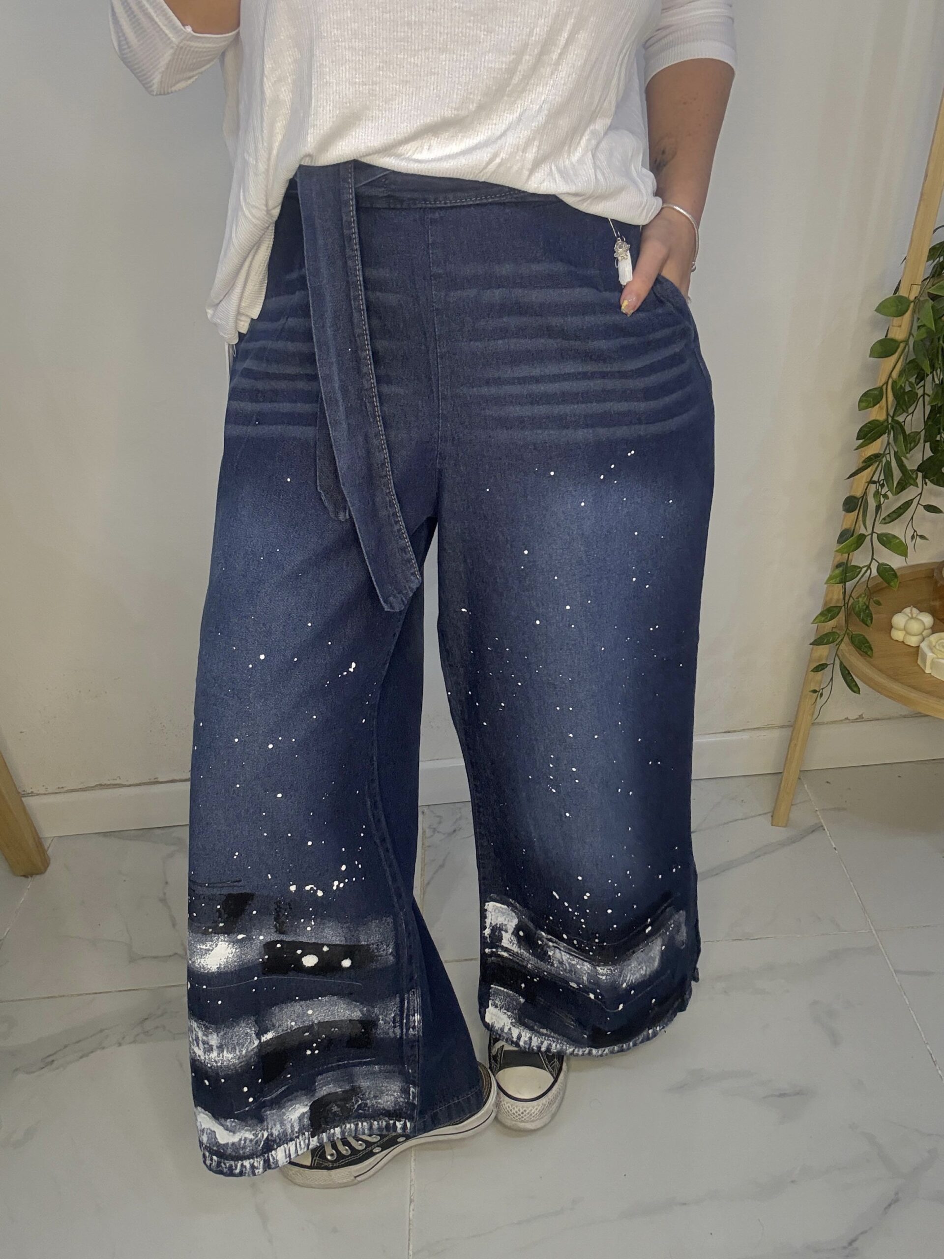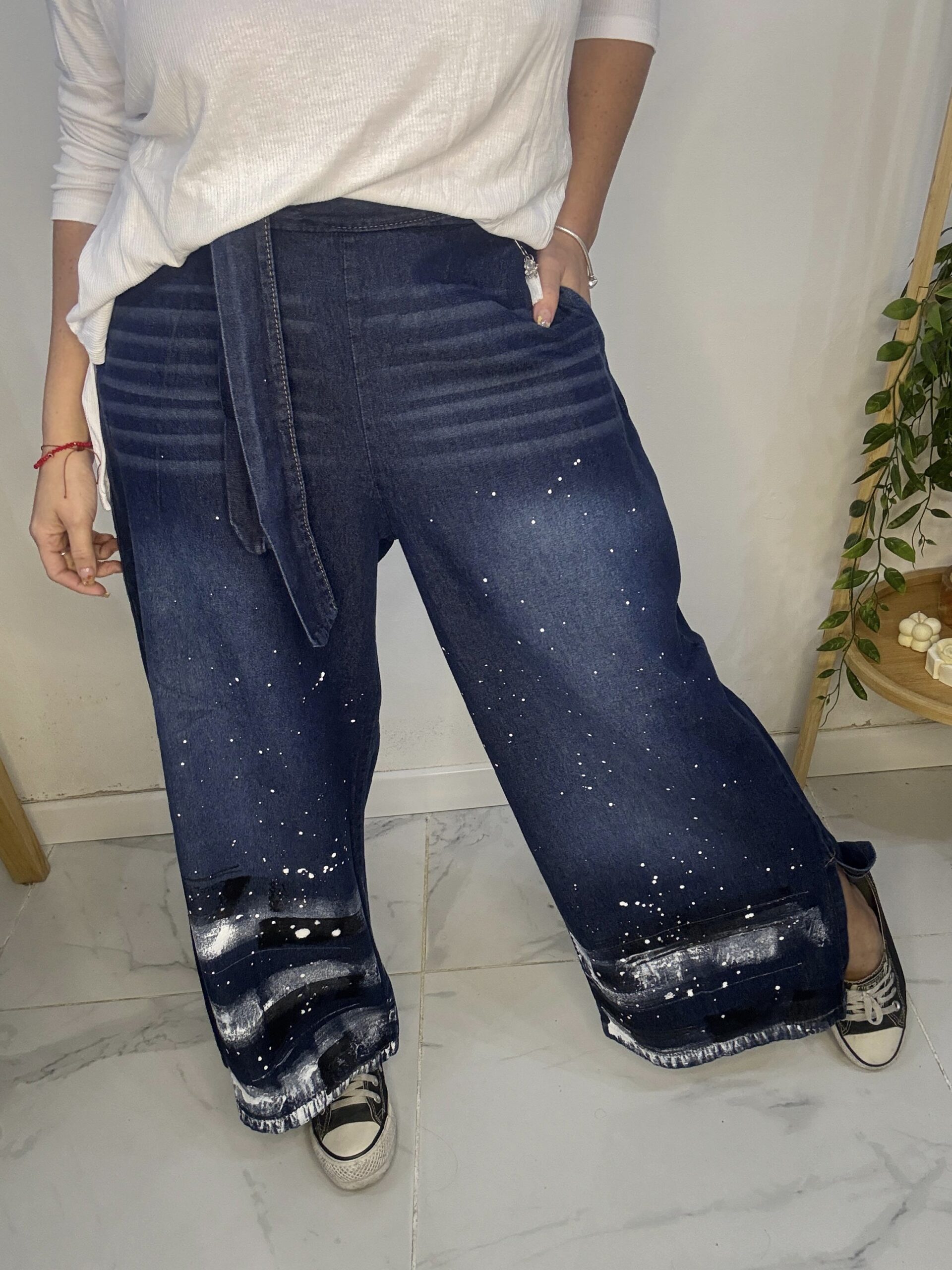 Pantalón de JEAN 😍 súper amplio con una caida que la rompe 🤍 son pintados a mano por ende, son artesanales hechos 1 × 1, tratándose de una prenda de diseño completamente exclusiva y única